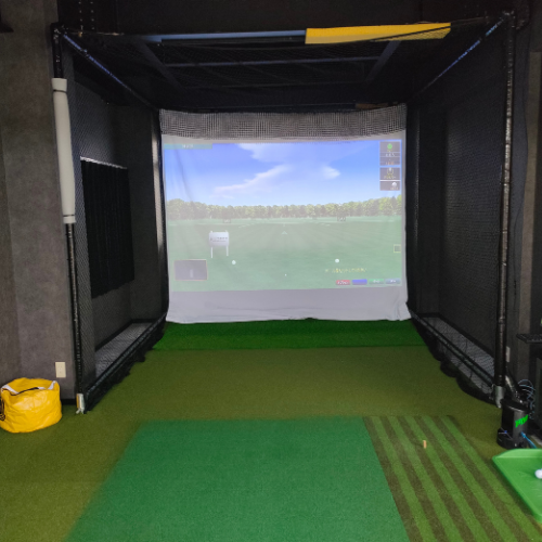 スクリーンに練習場風景やコースのティーショットを想定した風景を投影し、実戦さながらの環境を整えています。