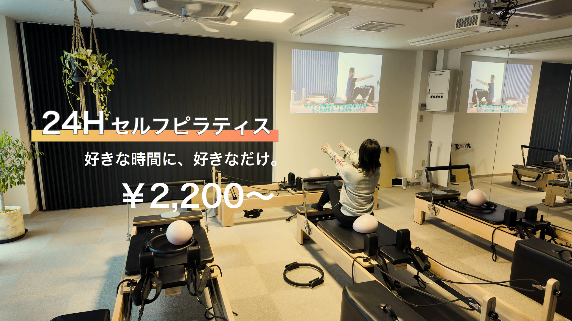 セルフピラティス(24時間営業)ではあらかじめ決まった時間になるとプログラムが大画面スクリーンに投影される仕組みとなっています。